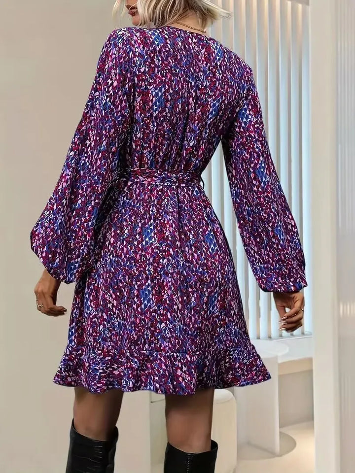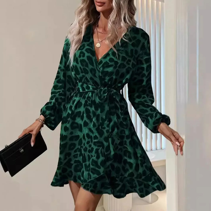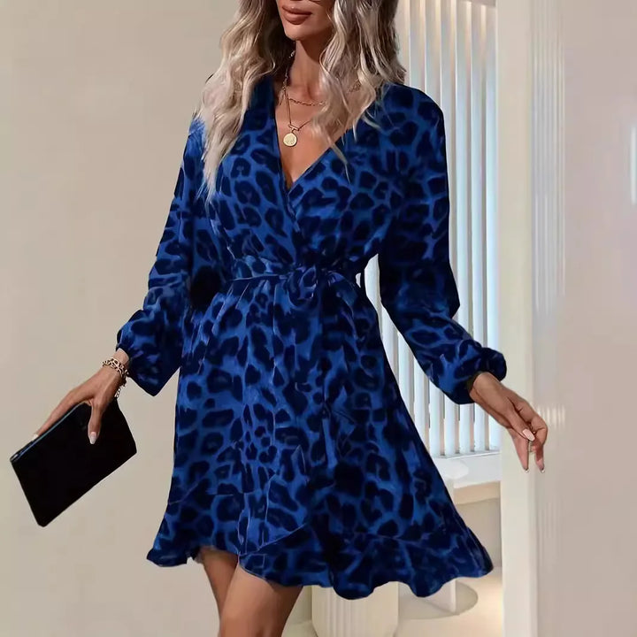 2025 Autumn and Winter Women New Long Sleeve V-neck Leopard Print Lace-up Ties Dress Women's Formal Party Mini Temperament Dress
