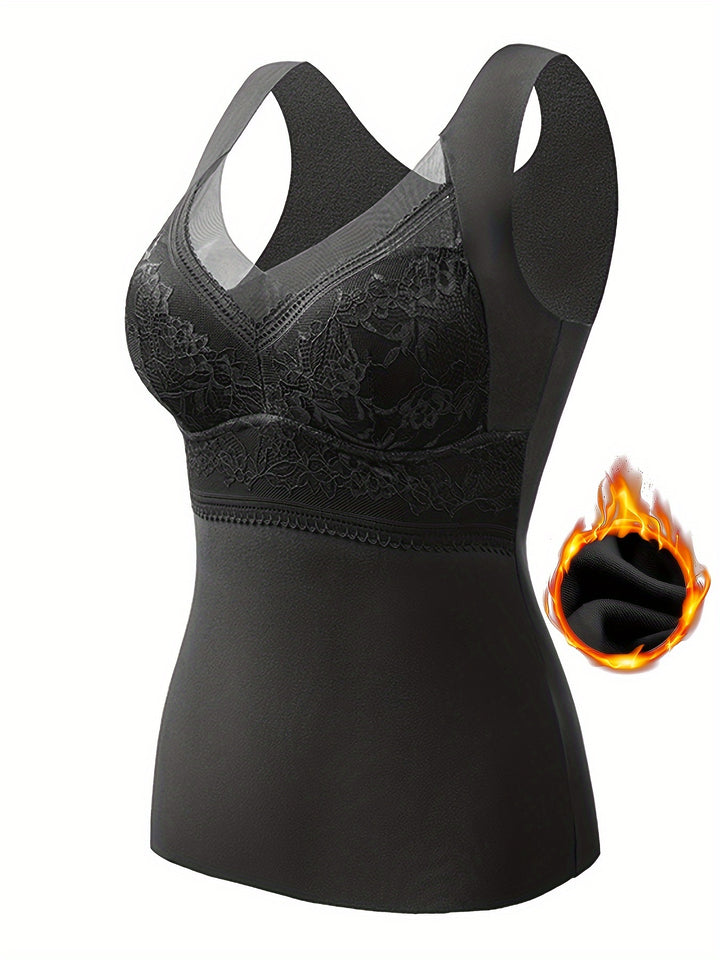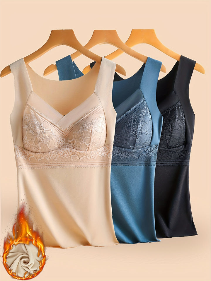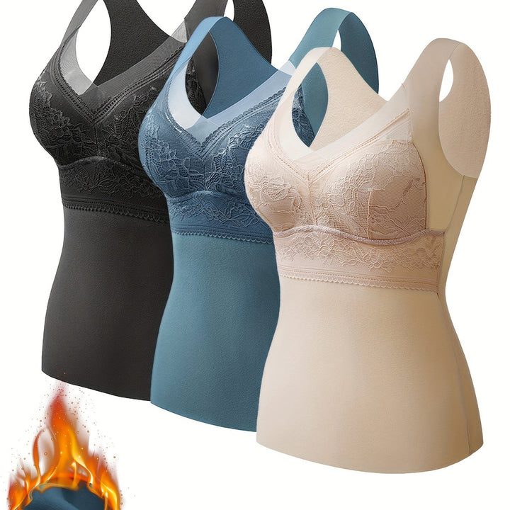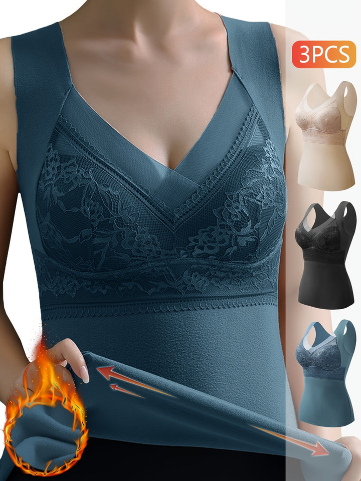 3-Pack EssElegance Women's Plus Size Thermal Wear, Elegant V-Neck, Seamless Chest Pads, Breathable Nylon, Knitted Fabric, Warm Innerwear Tops for Fall/Winter