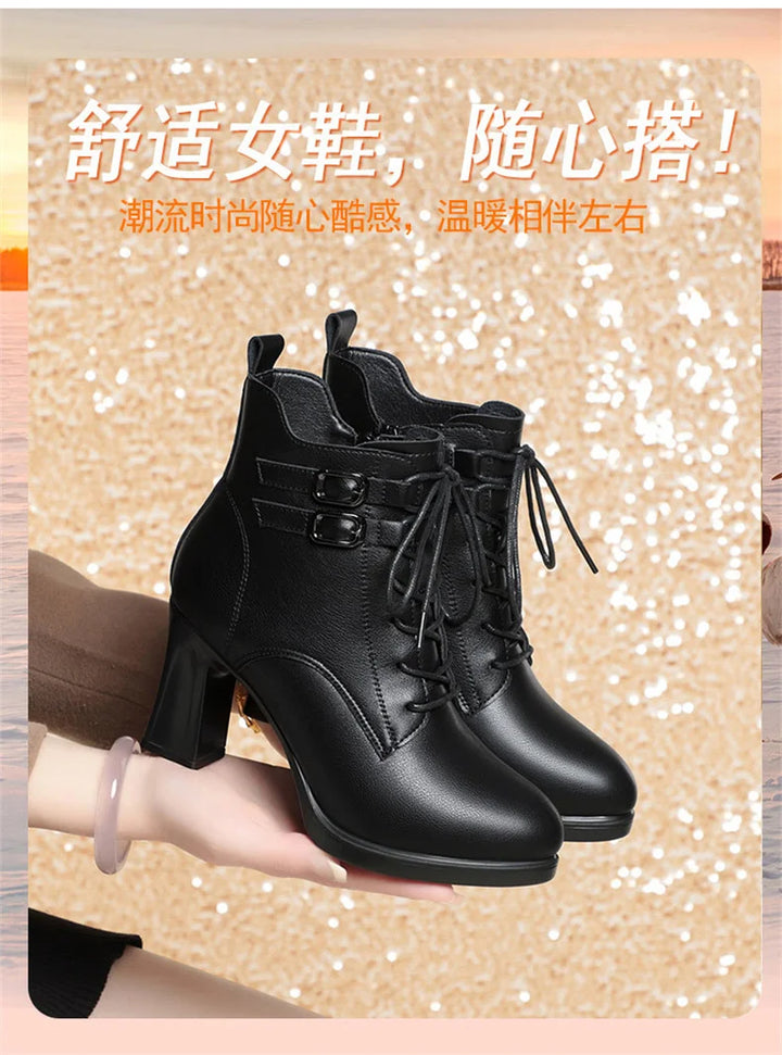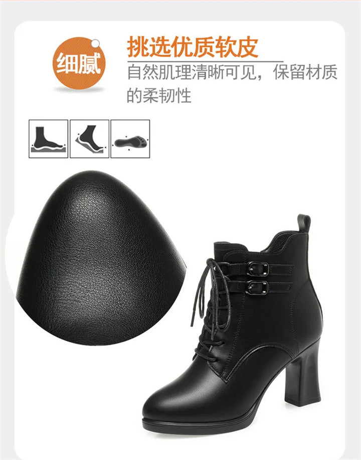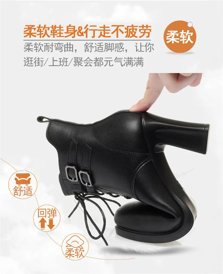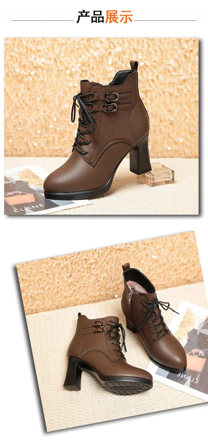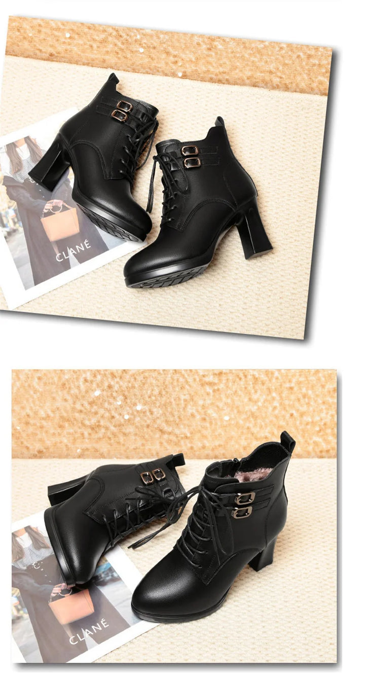 7.5cm Double Buckle Block High Heels Boots Platform Shoes Winter 2024 Women's Soft Leather Plush Fur Ankle Boots for Office Mom