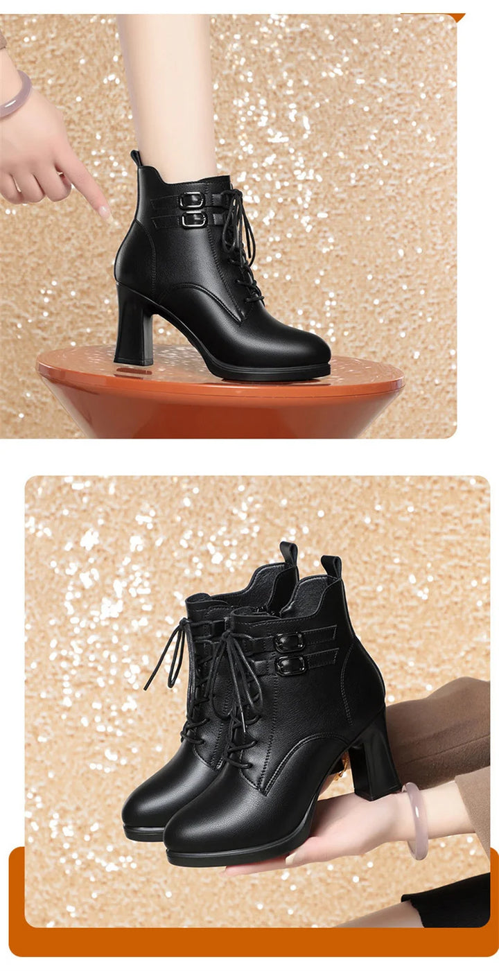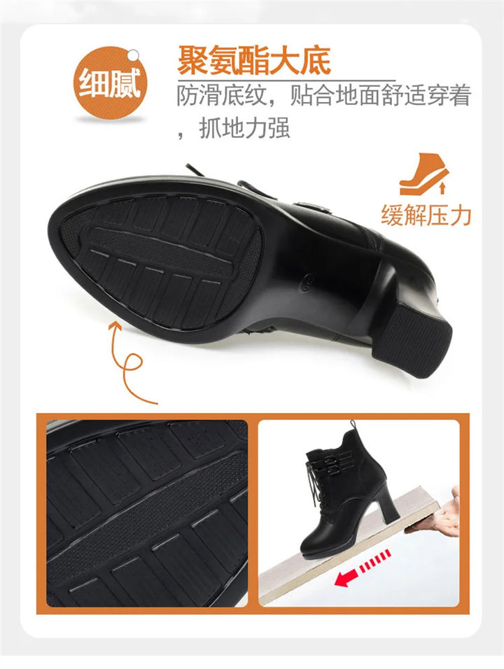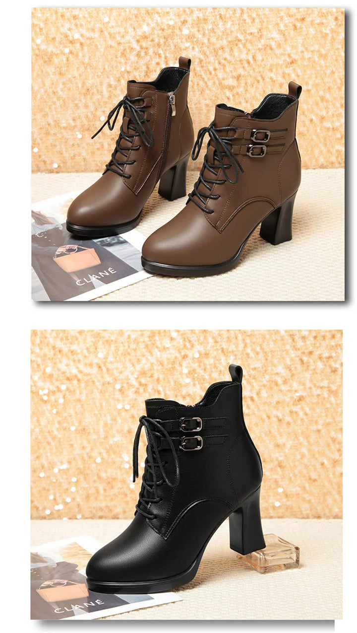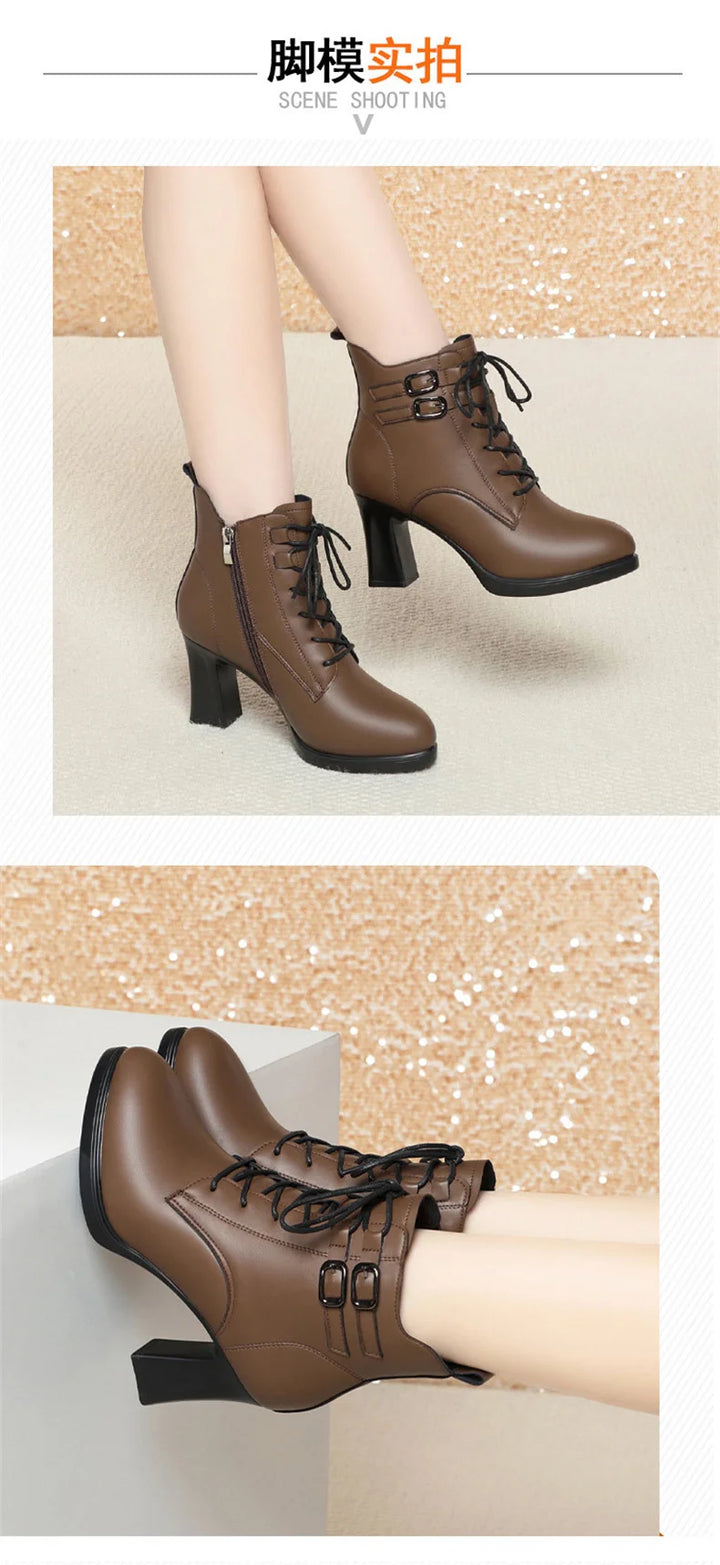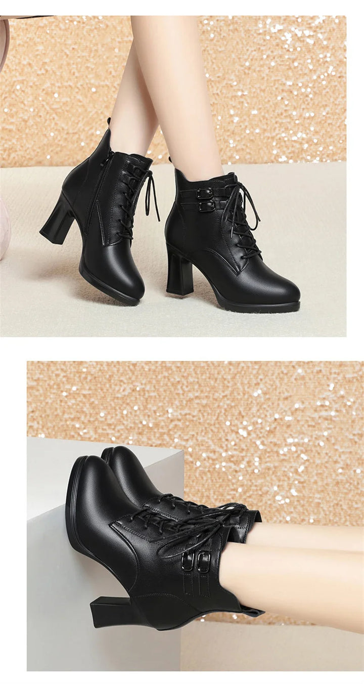 7.5cm Double Buckle Block High Heels Boots Platform Shoes Winter 2024 Women's Soft Leather Plush Fur Ankle Boots for Office Mom