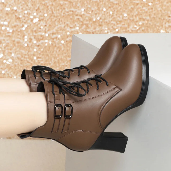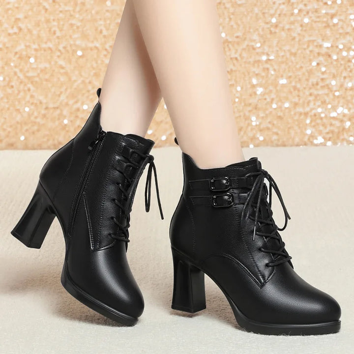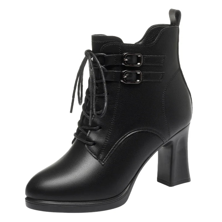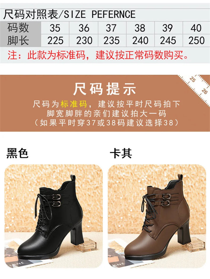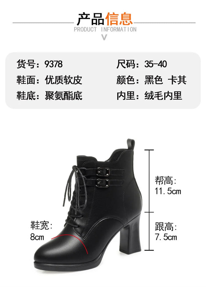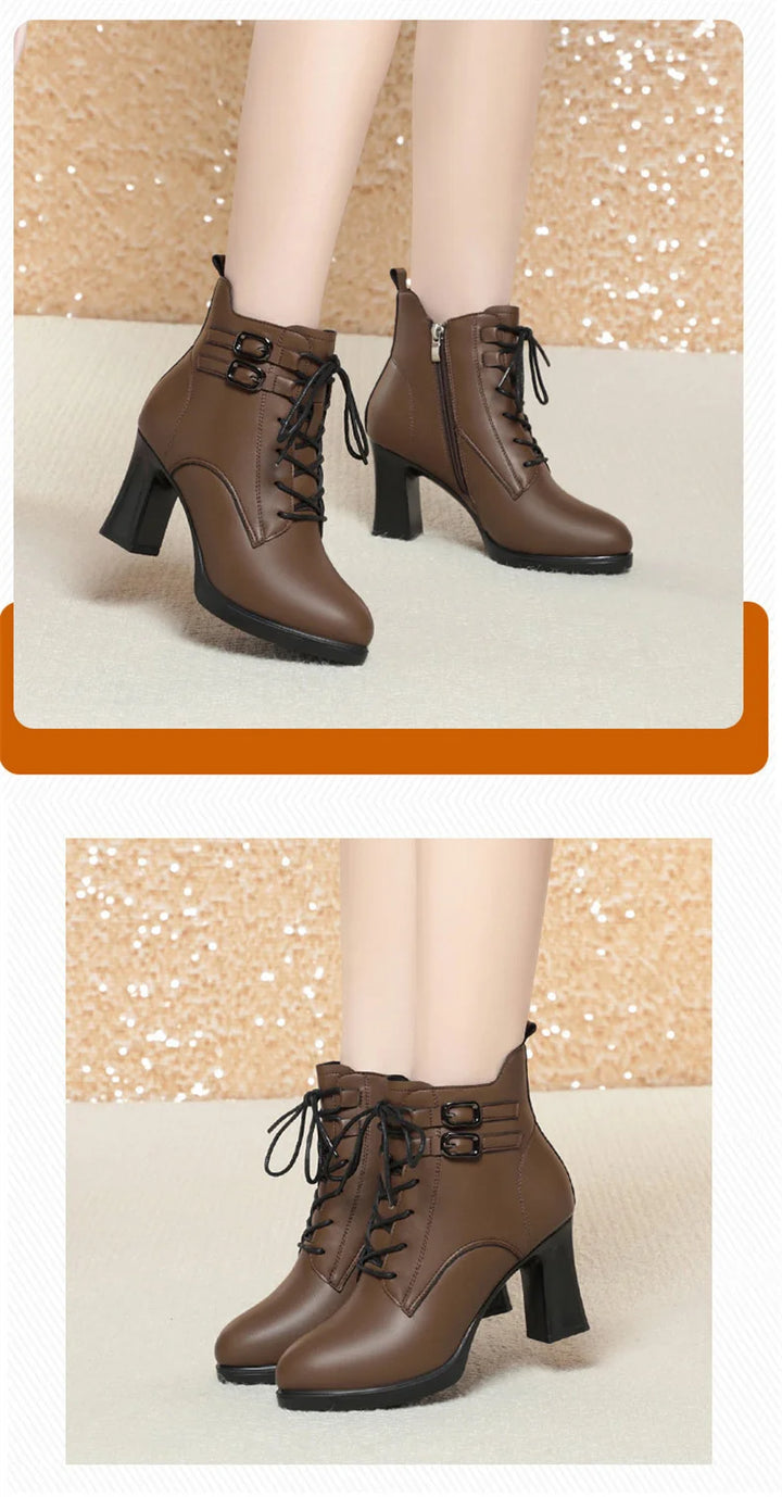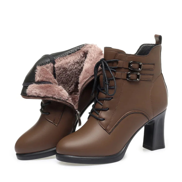 7.5cm Double Buckle Block High Heels Boots Platform Shoes Winter 2024 Women's Soft Leather Plush Fur Ankle Boots for Office Mom