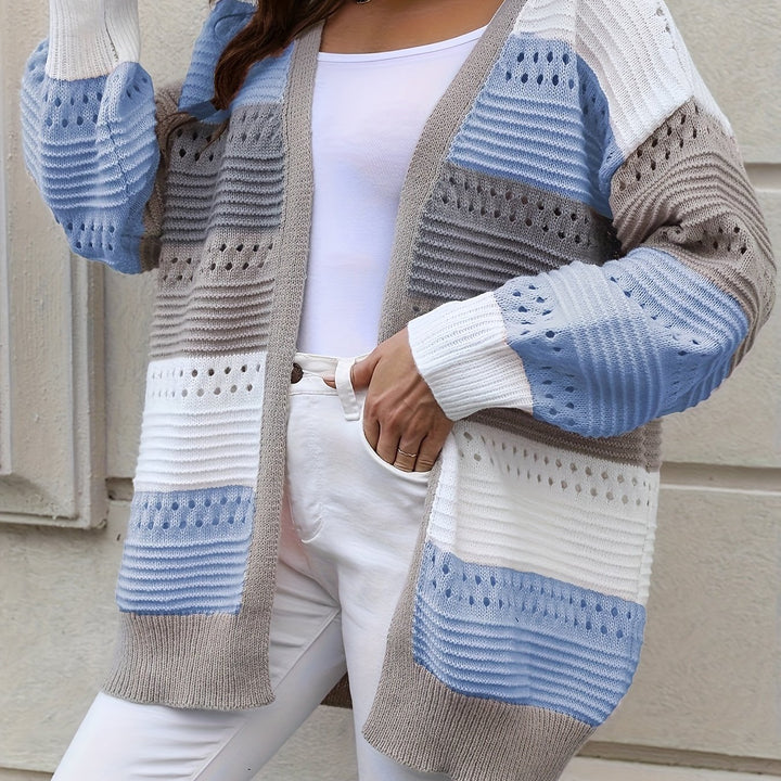 Casual Autumn Wear| Women's Plus Size Color Block Open Front Cardigan - Casual V-Neck, Eyelet Detail, Long Sleeve, Knit Sweater - Machine Washable, Polyester - Ideal for Fall/Winter, Fall Sweaters