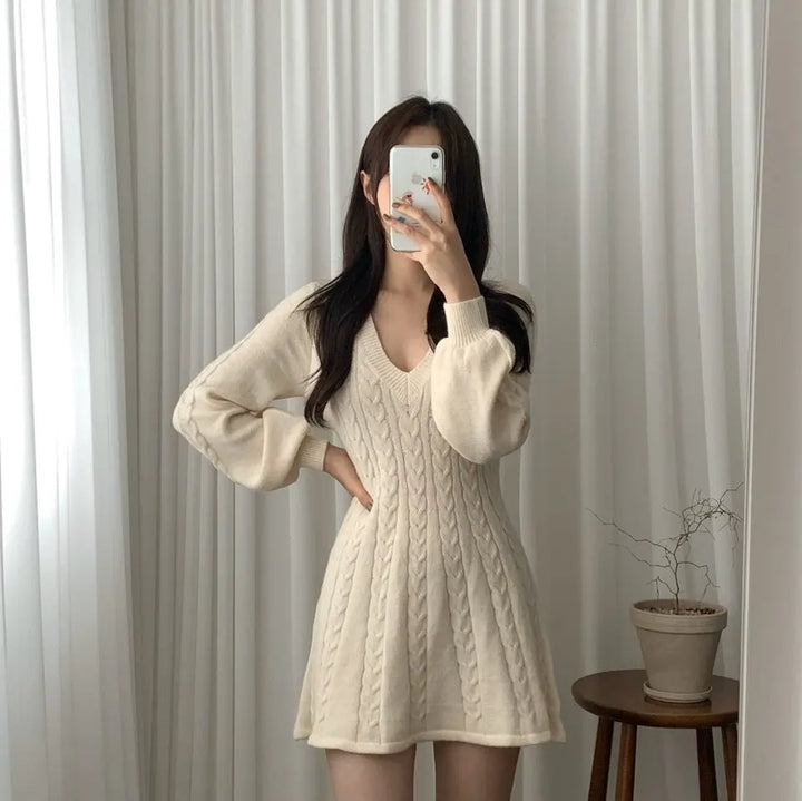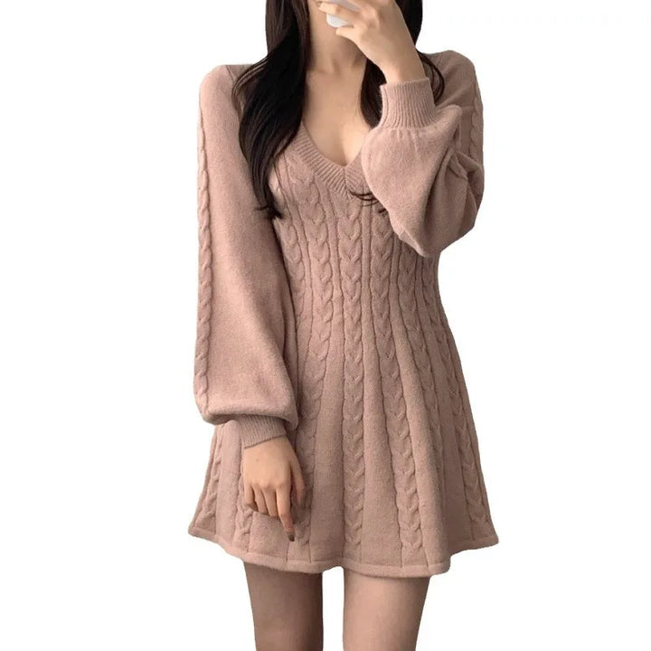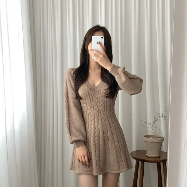 Dresses Women Knitting Sweater Dress V Neck Lantern Sleeve Knitted Above Knee A Line Office Lady 2025 Autumn Winter Vestidos