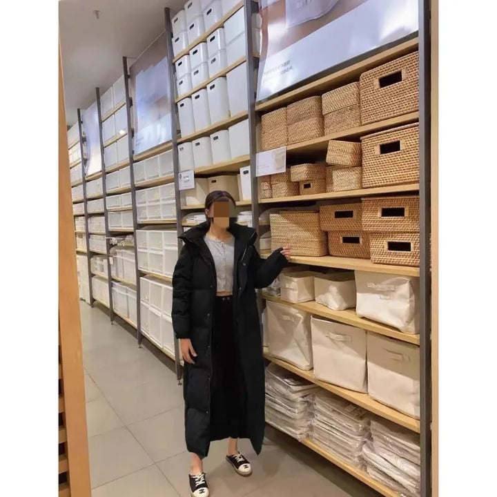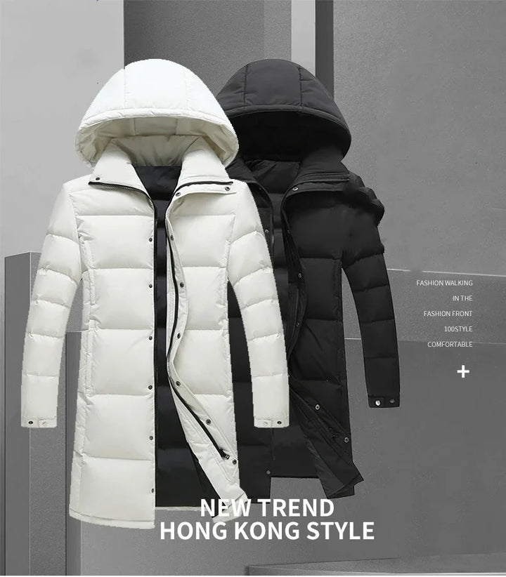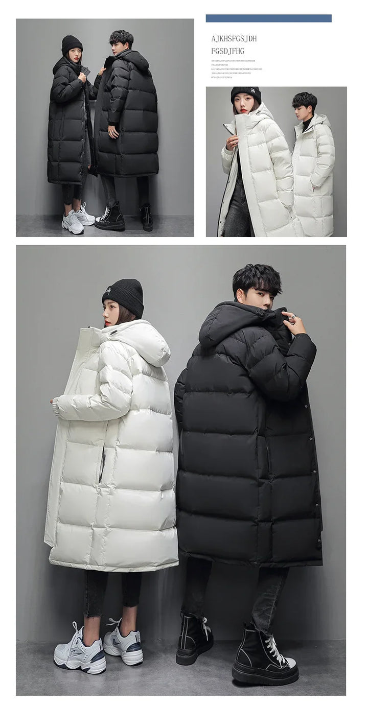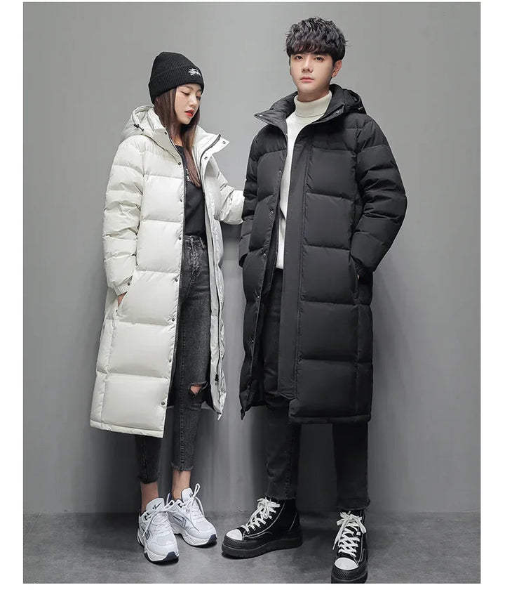 FGKKS 2025 Couple Winter Down Jacket Fashion Classic Slim Korean Style White Duck Down Men's Long Coat Women Hooded Outwear