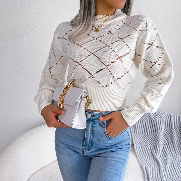 Knitted Pullovers Women 2025 Autumn Winter Casual Long Sleeve Hollow Out Sweater Crop Top White Pink Khaki