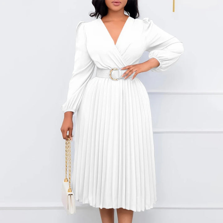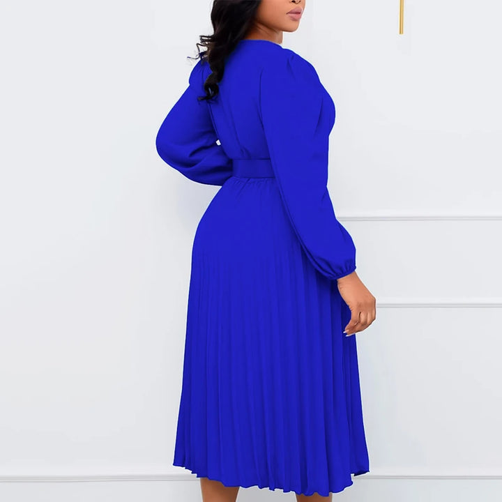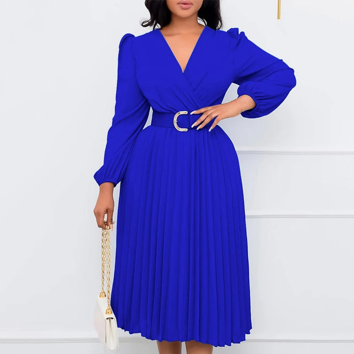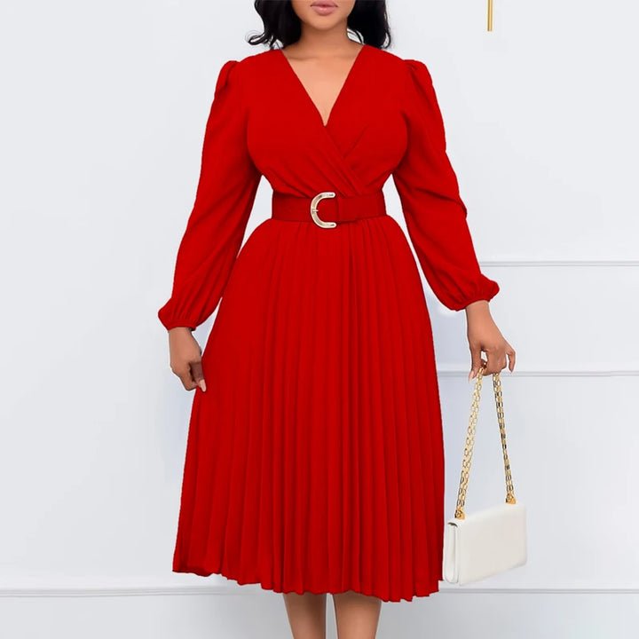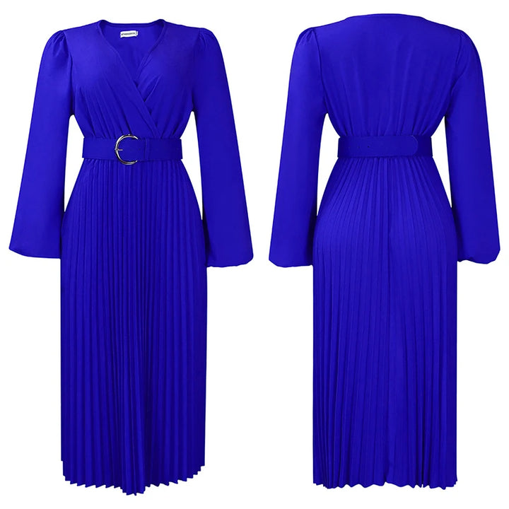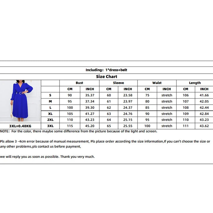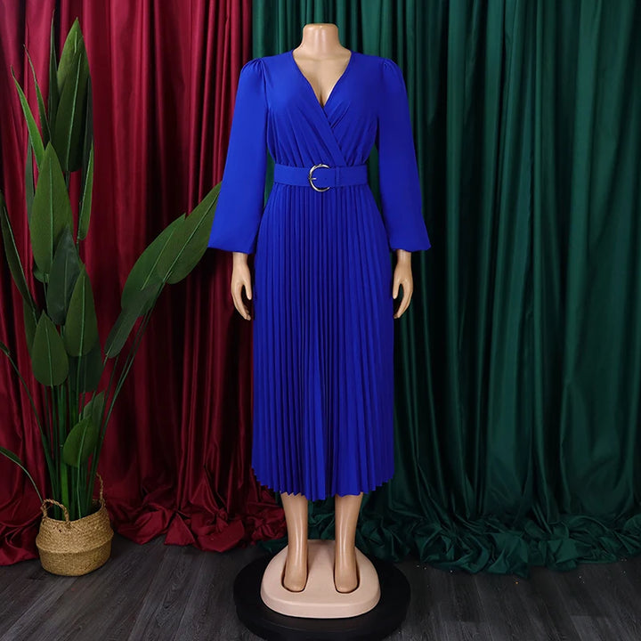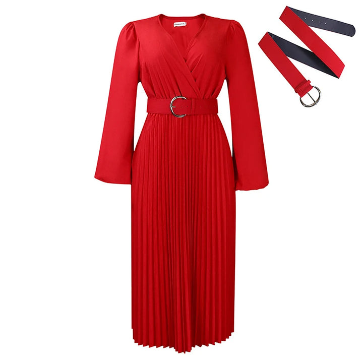 Large Women's 2025 Autumn/Winter New Fashion Long Sleeve V-Neck Pleated Mid length Belt Temperament Dress Clothes Dropshipping