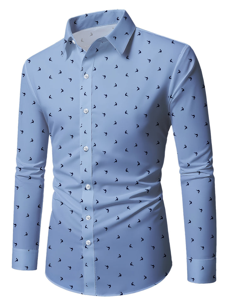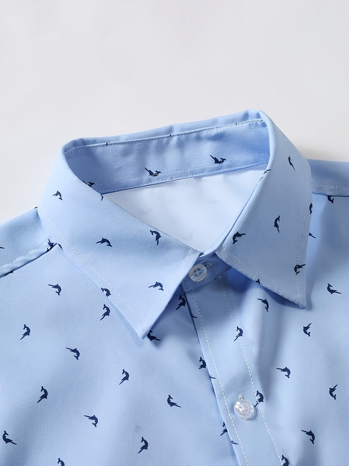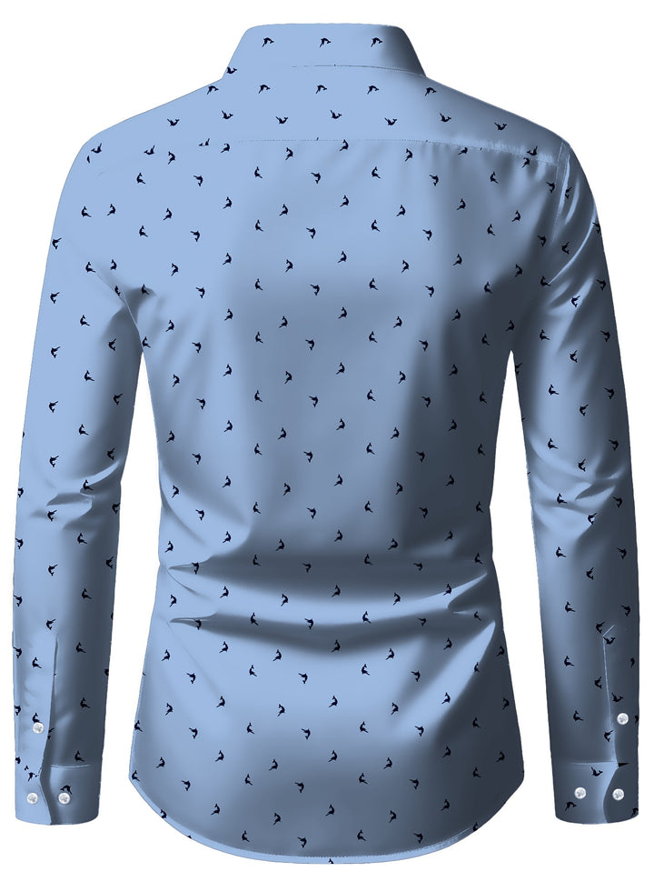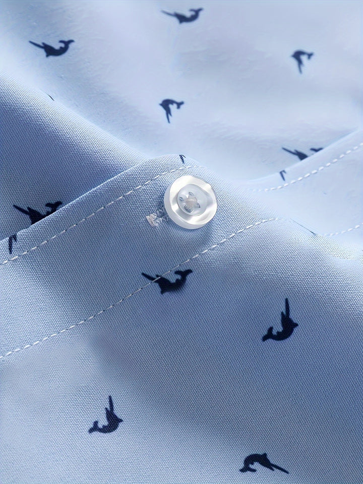 Men'S 2025 New Fashion Business Casual Dress Shirt - Polyester, Dolphin Symbol Print, Non-See-Through Fabric, Classic Collar Design, Durable & Smooth Texture, All-Season Wear for Commuting, Parties, and Street Style, Party At