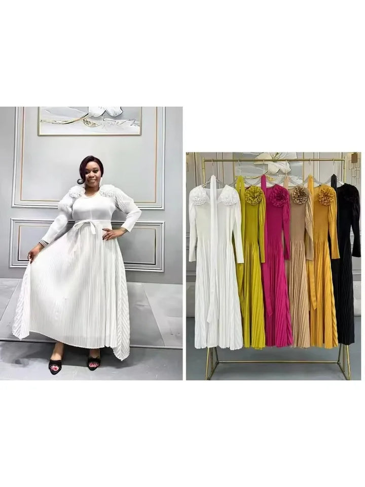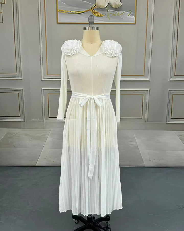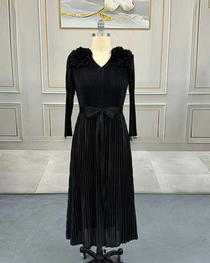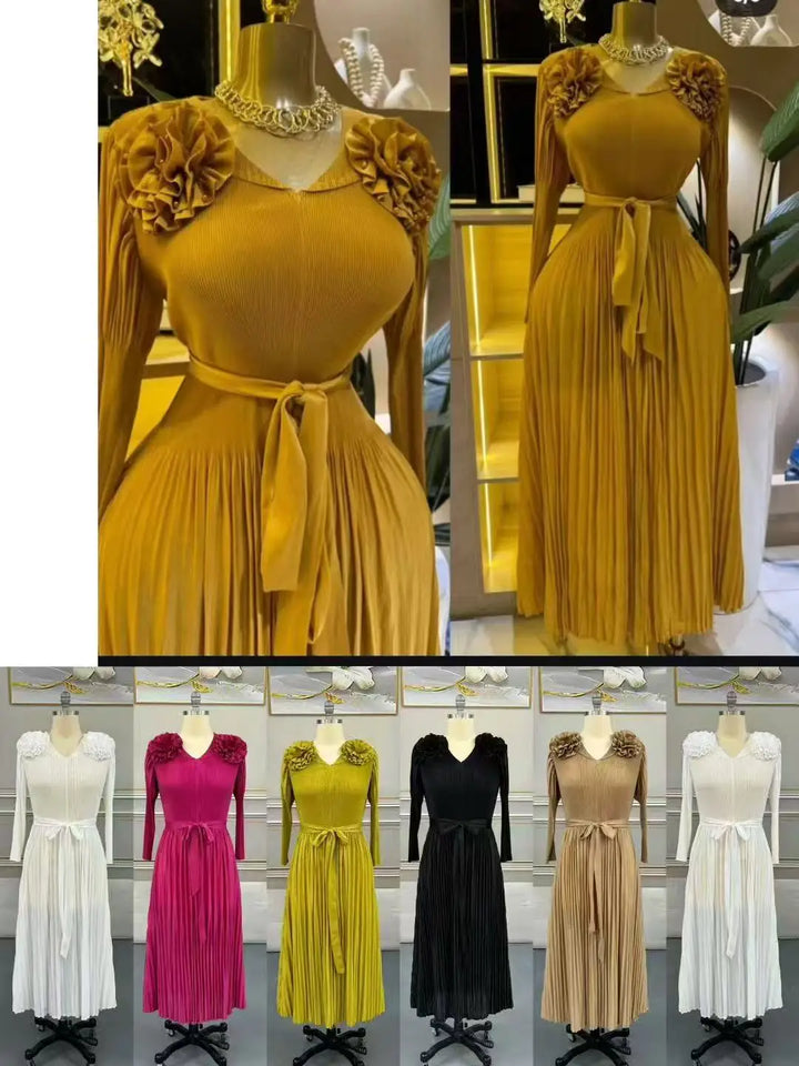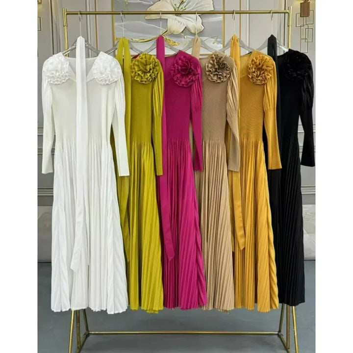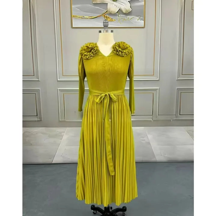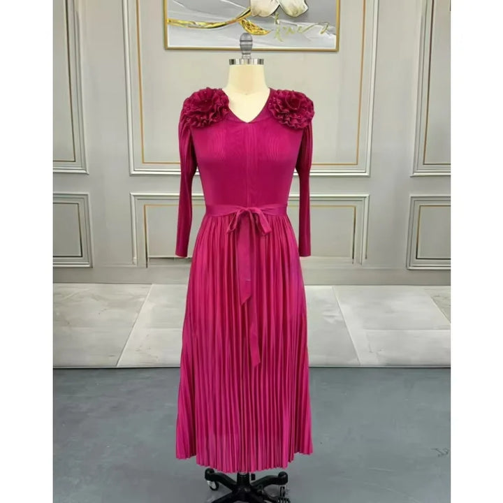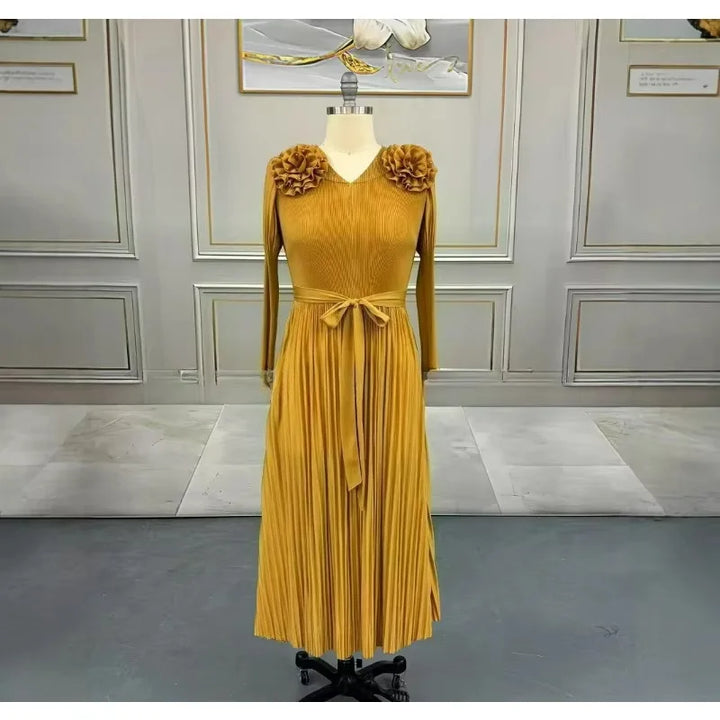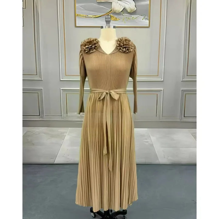 Miyake Temperament Women's Dress 2025 Long Sleeve Deep V Waist Pleated Dresses 2025 Spring/Summer New