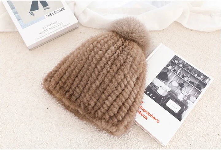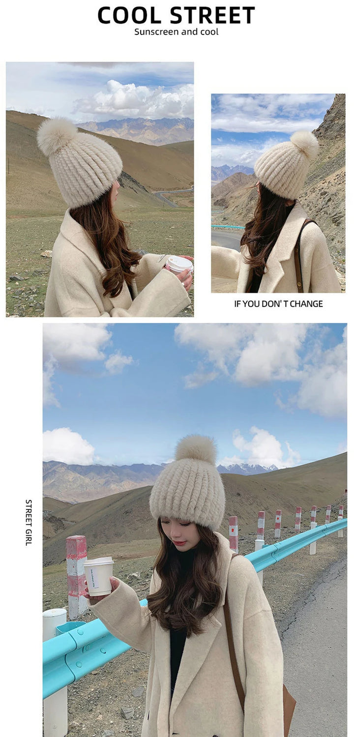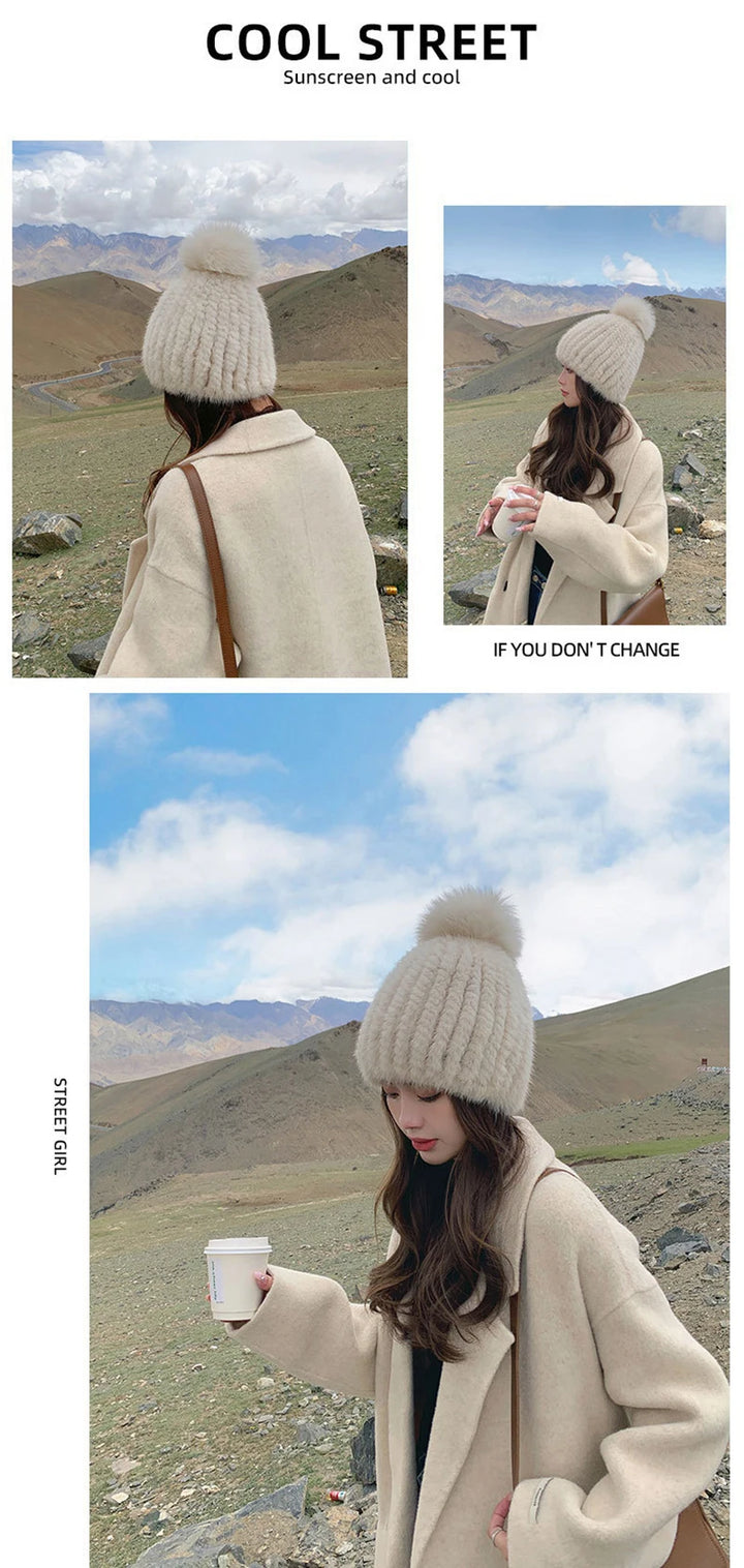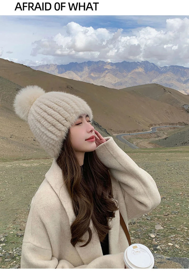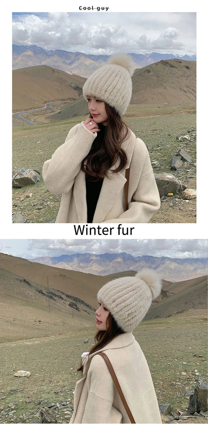 Real Mink Fur Hat For Women New Brand Thicken Female Fur Caps Ladies Winter Knitted Mink Fur Beanies With Fox Fur Pompoms Hat