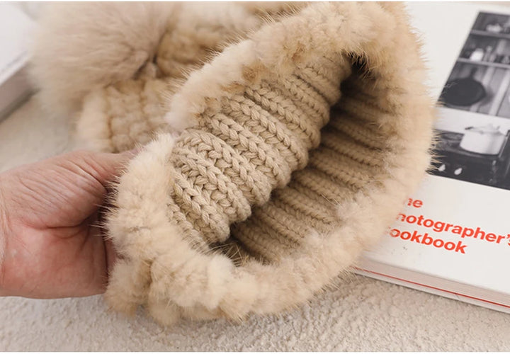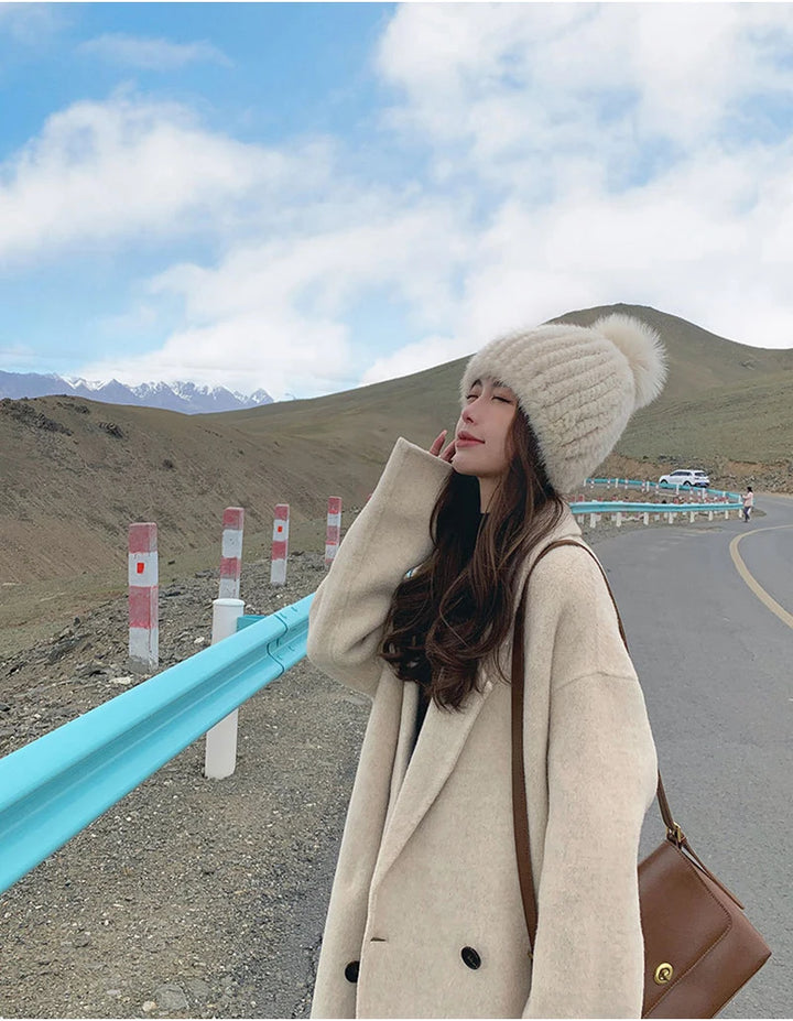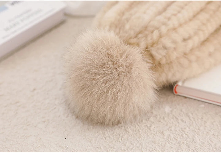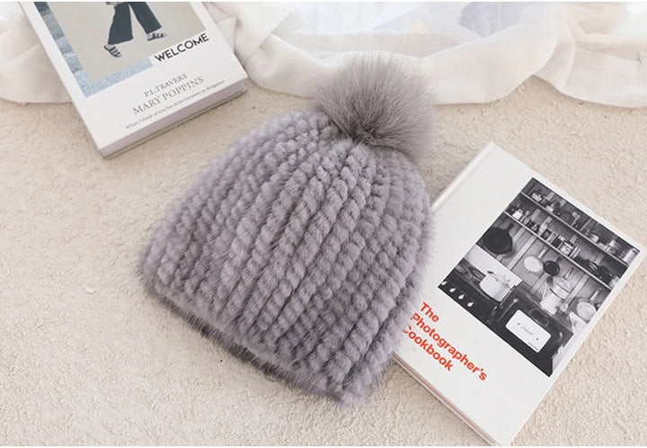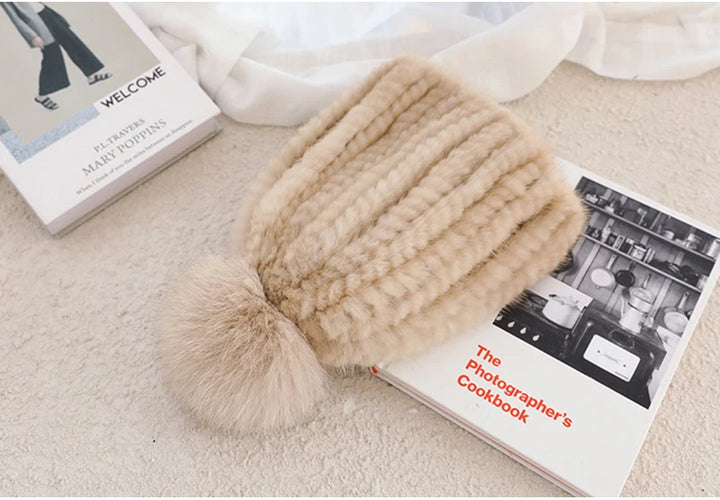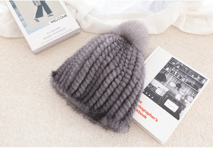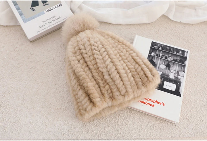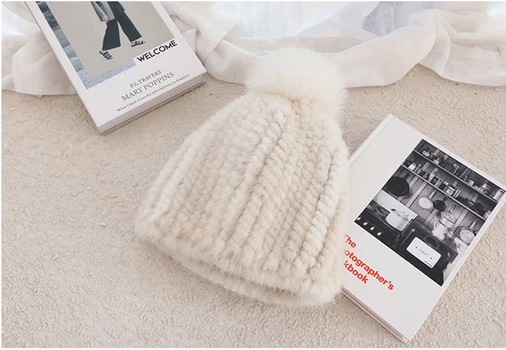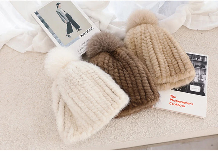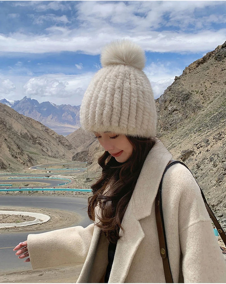 Real Mink Fur Hat For Women New Brand Thicken Female Fur Caps Ladies Winter Knitted Mink Fur Beanies With Fox Fur Pompoms Hat