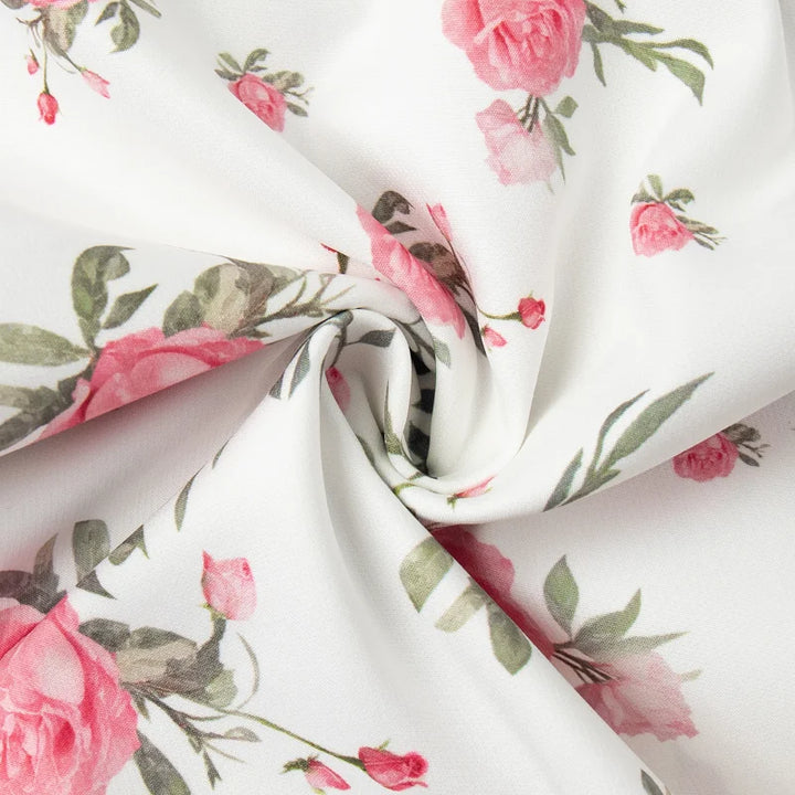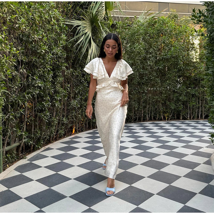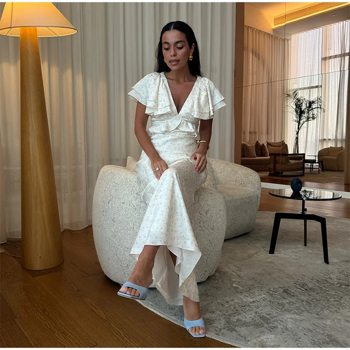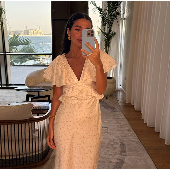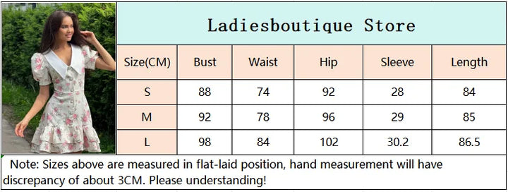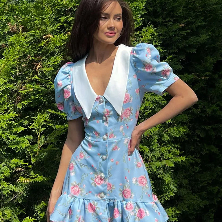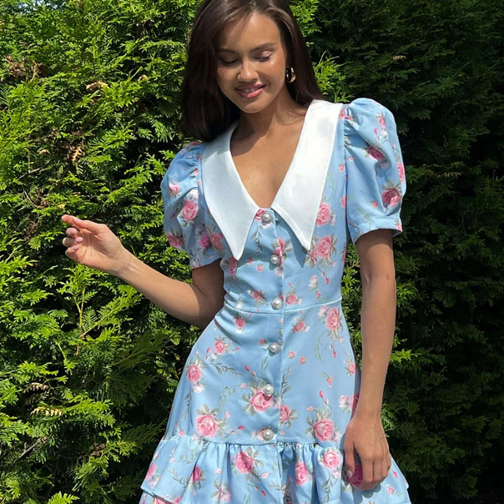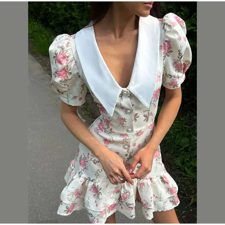 Sweet Floral Printed Ruffle Hem Dress Chic A-line Lapel Puff Sleeve Dresses For Women 2025 Summer Lady Holiday Street Gowns New