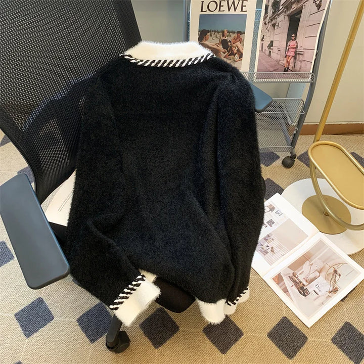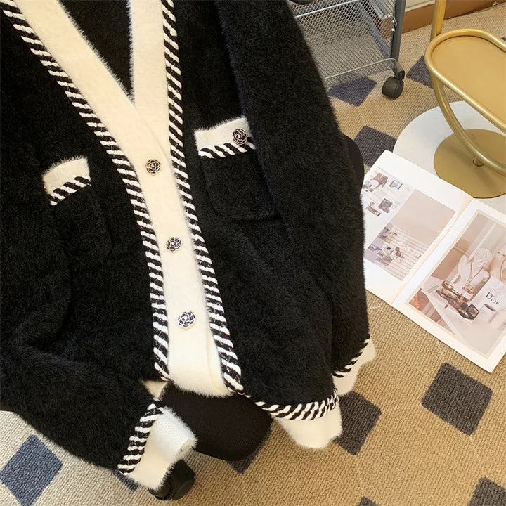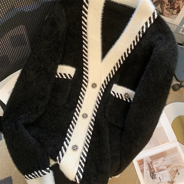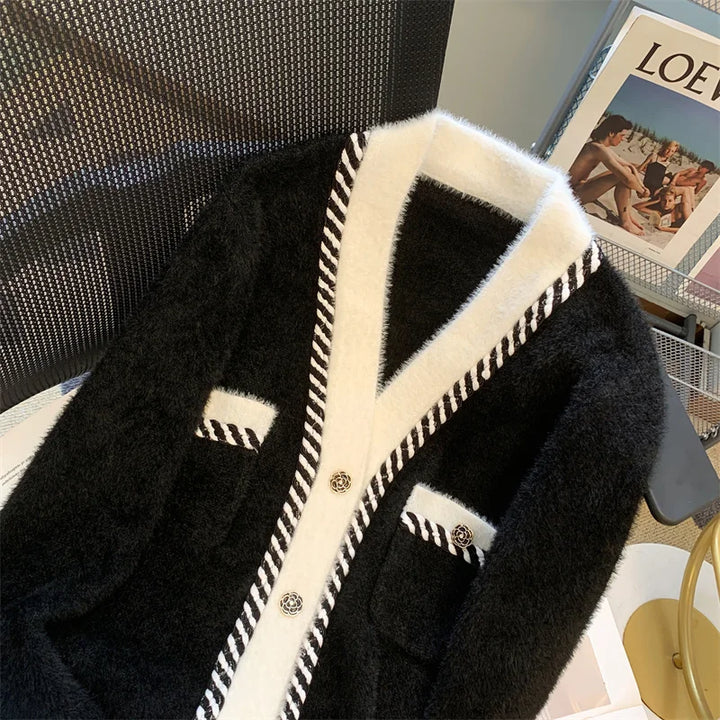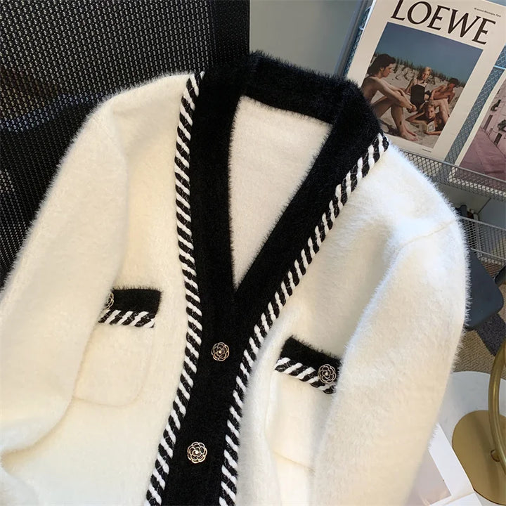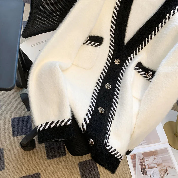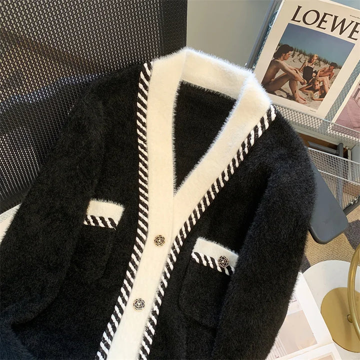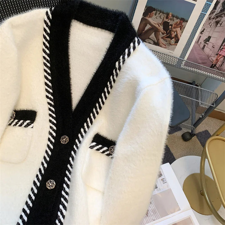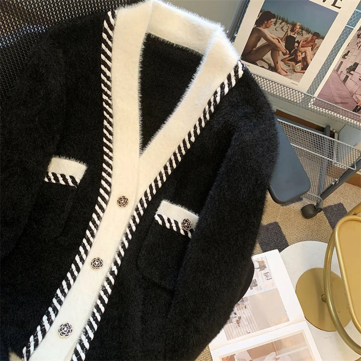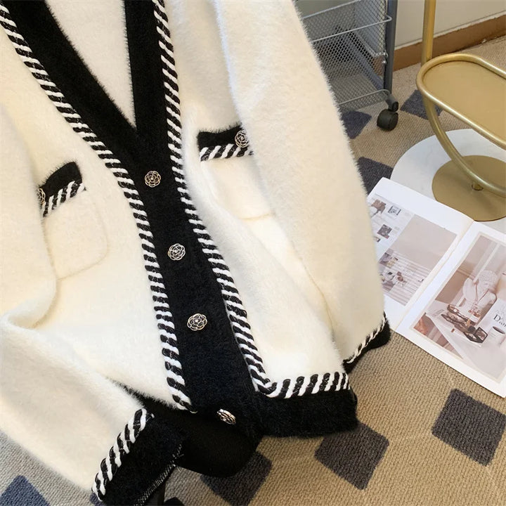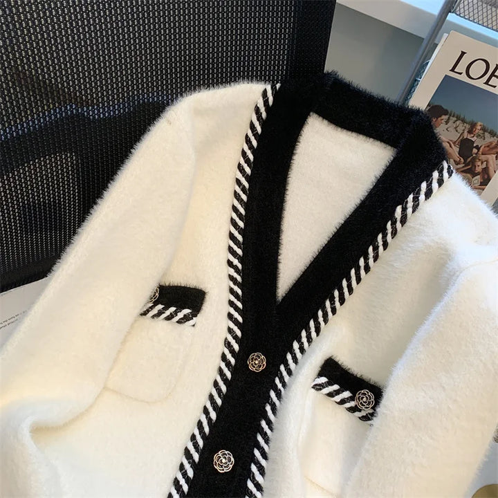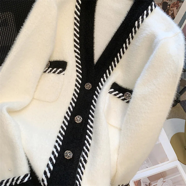 Vintage Elegant Plaid Knitted Cardigan Sweater For Women 2025 Autumn Winter Long Sleeve V-neck Tops Knitwear Fashion Chic Jumper