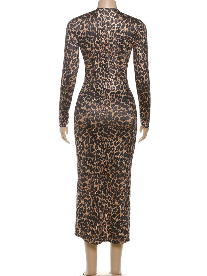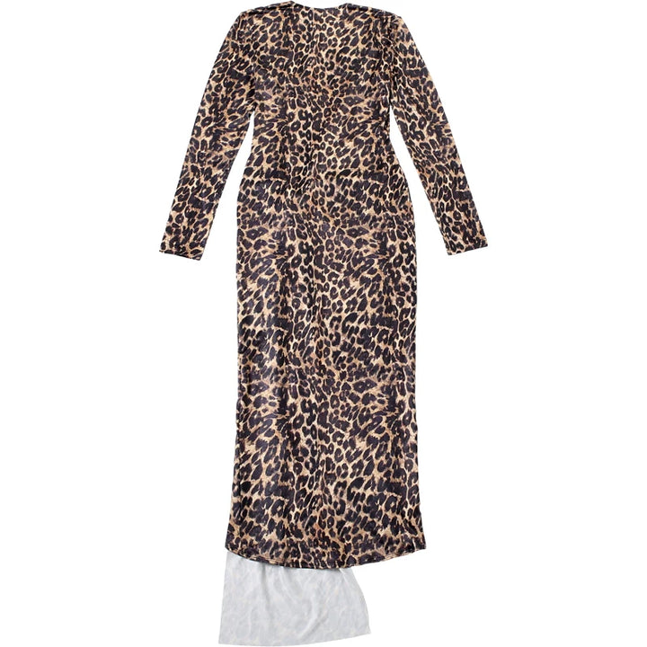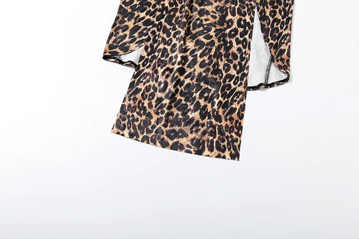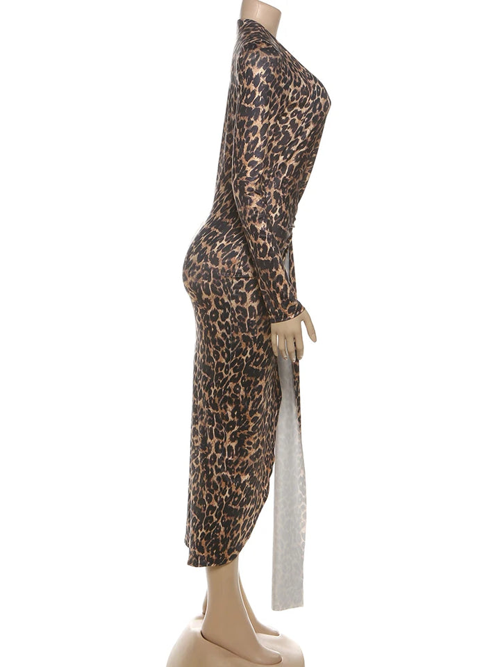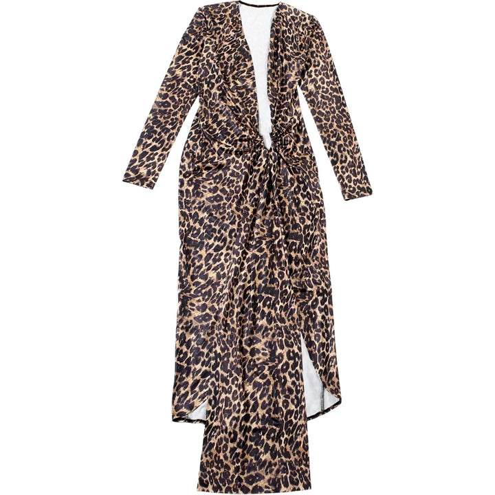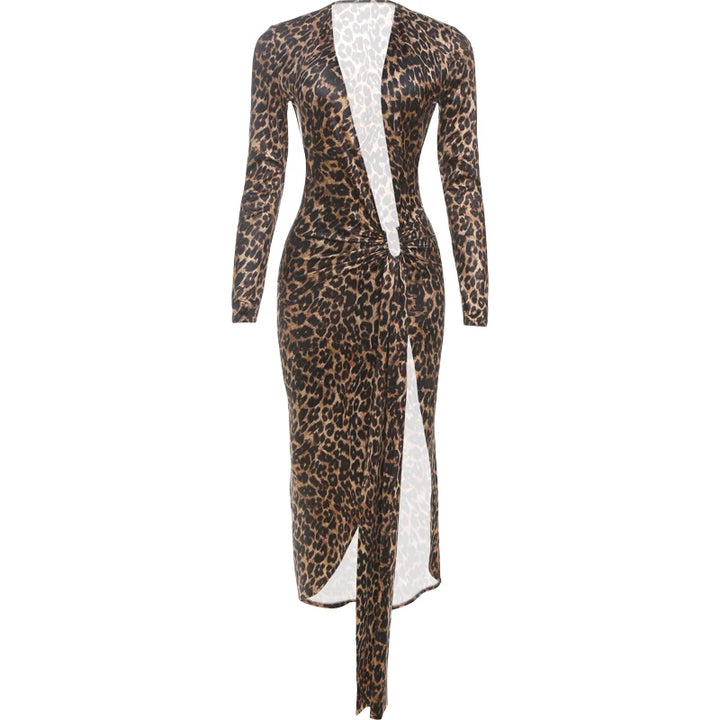 Weird Puss Leopard Print Women Dress Y2K Sexy Deep V-Neck Ruched Ribbon Skinny High Split Nightclub Party Fall Hipster Vestidos
