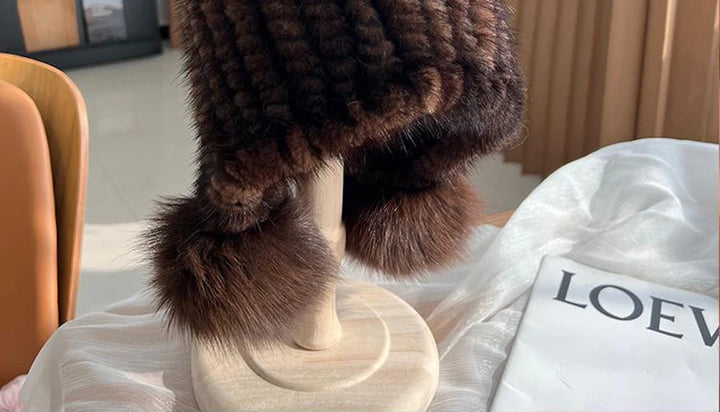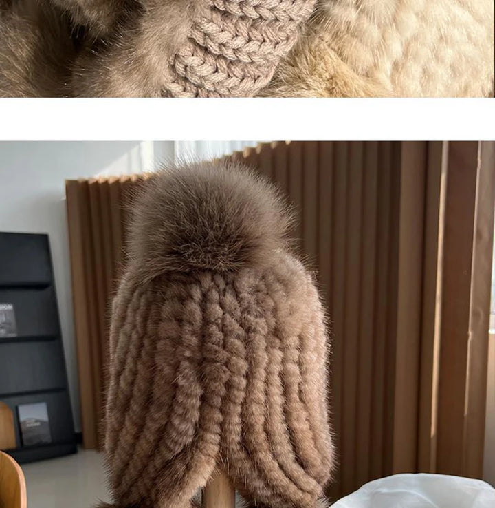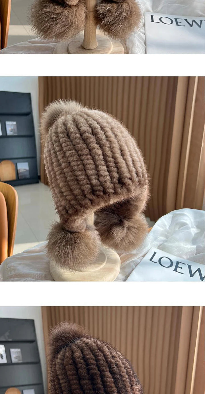 Winter Hot Sale Real Mink Fur Hat For Women Knitted Mink Fur Ear Warm Cap The Spiral Beanies Cap With Fox Fur Pompom On The Top