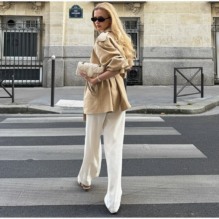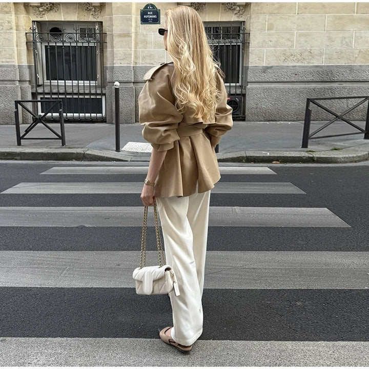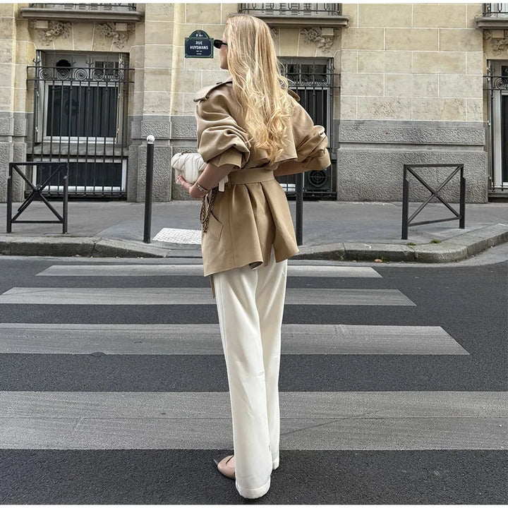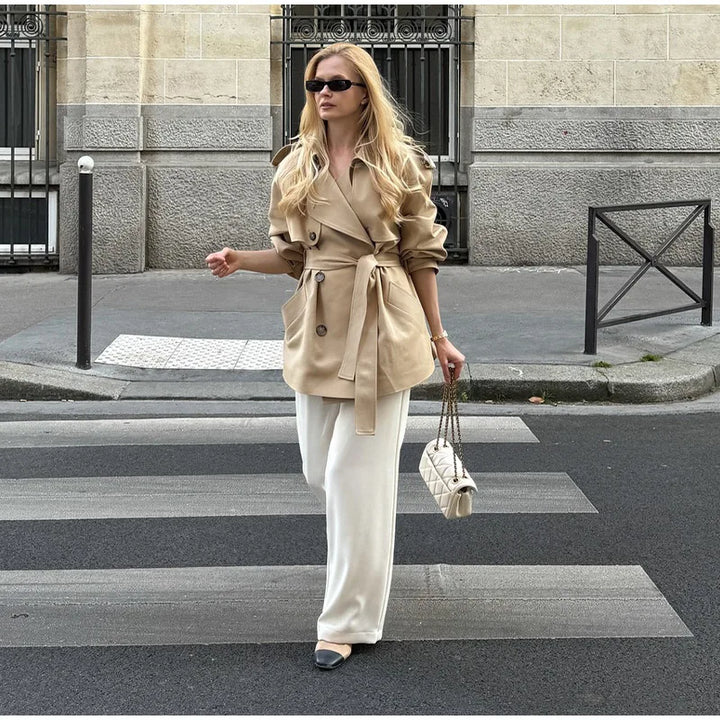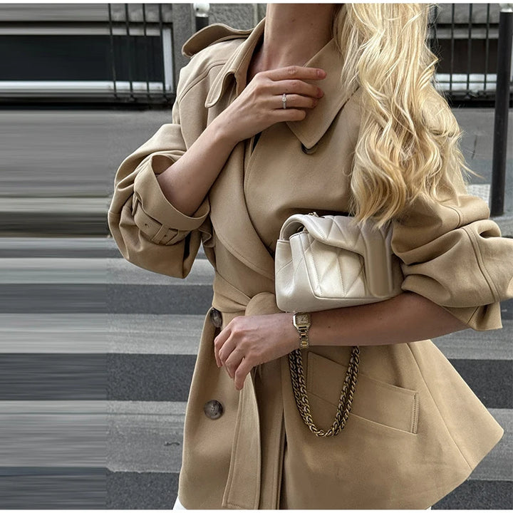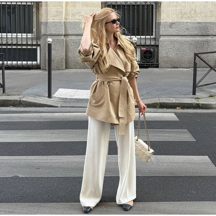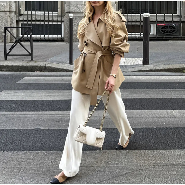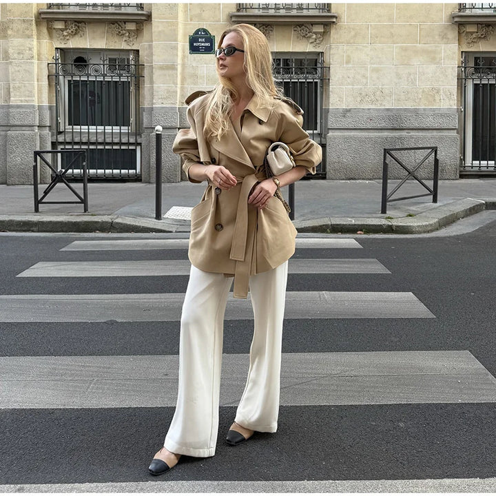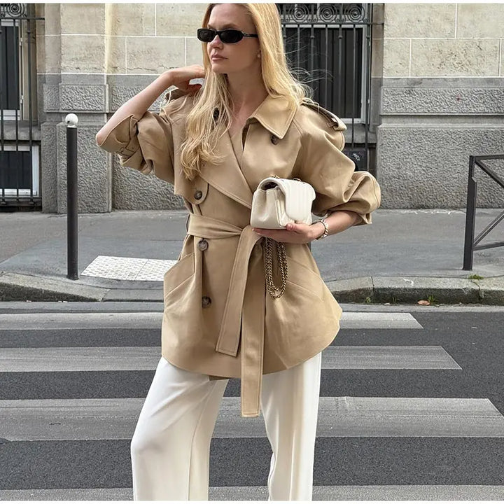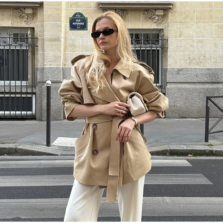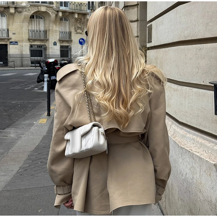 Women's Khaki Belted Trench Coat Fashion Lapel Collar Double Button Design Loose Fit Short Overcoat 2025 Autumn Female Outerwear